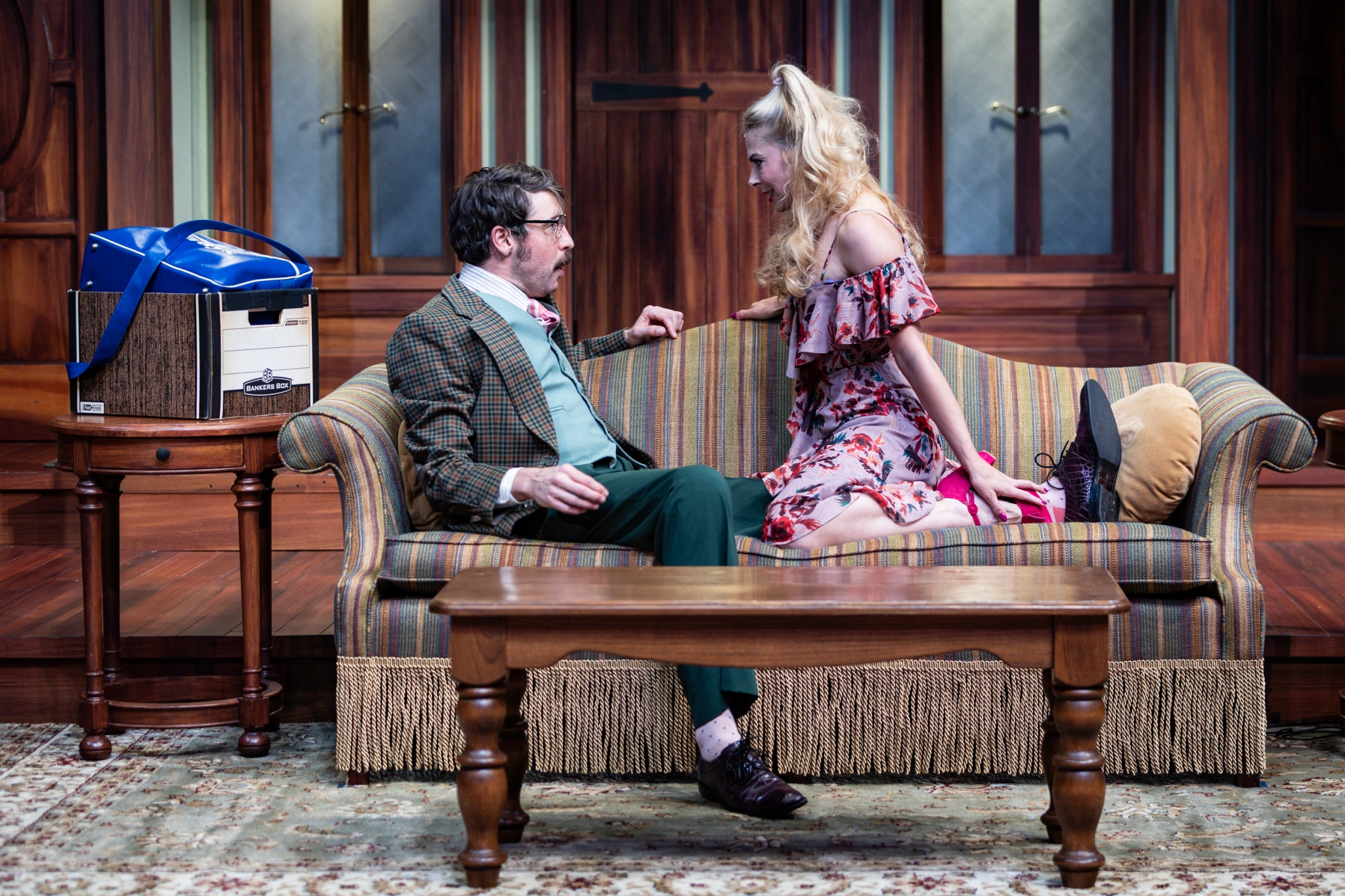 But the comedy of this play really ratchets into high gear after the intermission. In the second act, it’s a month later, and the show is now on tour. Once again, we see the first act of Nothing On, but this time from behind the scenes (the set rotates to reveal the backstage area). We get the impression that the ensemble may have pulled the threads of the play together at some point in the intervening weeks, but now it’s all unravelling. Garry and Dottie are having a furious lover’s quarrel because the jealously possessive Garry believes Dottie is cheating on him with Frederick; Lloyd has secretly arrived from another gig, hoping to get in a weekend of canoodling with the farce’s blonde bimbo Brooke (the wonderful Lara Hayhurst); Poppy (Saige Smith), the stage manager and Lloyd’s jilted girlfriend, needs to talk to Lloyd about something important (not hard to guess what that could be); and on top of it all Selsdon has access to a bottle of whisky, which must be kept from him at all costs. Uproarious chaos ensues backstage as the members of the company, led by the overinvolved Belinda (Gwendolyn Kelso), try to cope with the various acts of sabotage and violence that Garry and Dottie inflict on each other and on Frederick and Brooke, all of which have disastrous consequences for the action onstage that we can hear and imagine, but not fully see. The third act, taking place two months later, reveals the effects, now again from the audience’s perspective, of the continued escalation of the ensemble’s infighting. By this point there is virtually “nothing on” stage anymore at all; the touring play has devolved into an incoherent mess in which some of the actors (mainly, the veterans Dottie, Garry, and Belinda) gamely attempt to improvise in response to the nonsensical appearance and disappearance of various props, objects, and people while others (namely, Brooke) doggedly stick to the script and blocking, producing ludicrous dissonance.